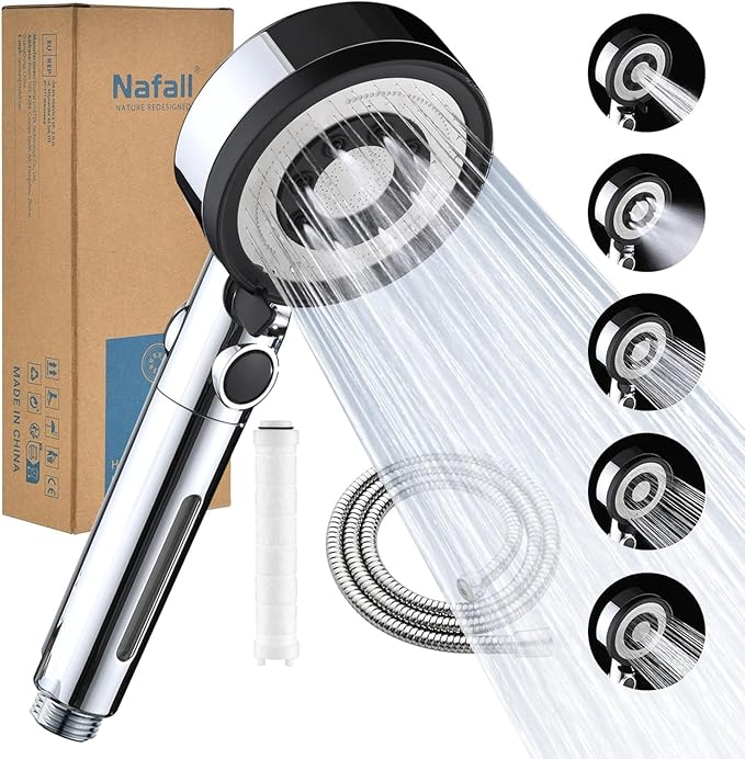 - 【5 Spray Modes】The Nafall water-saving shower head with filter is available in Pulse, Mist, Rain 1, Rain 2, and Spray modes. The different modes can be easily switched with a single button press on the shower head, and each spray mode offers a different showering experience. This multifunctional shower head is suitable for daily hair washing, gentle showering, massage, bathing children or pets, bathroom cleaning, and more.