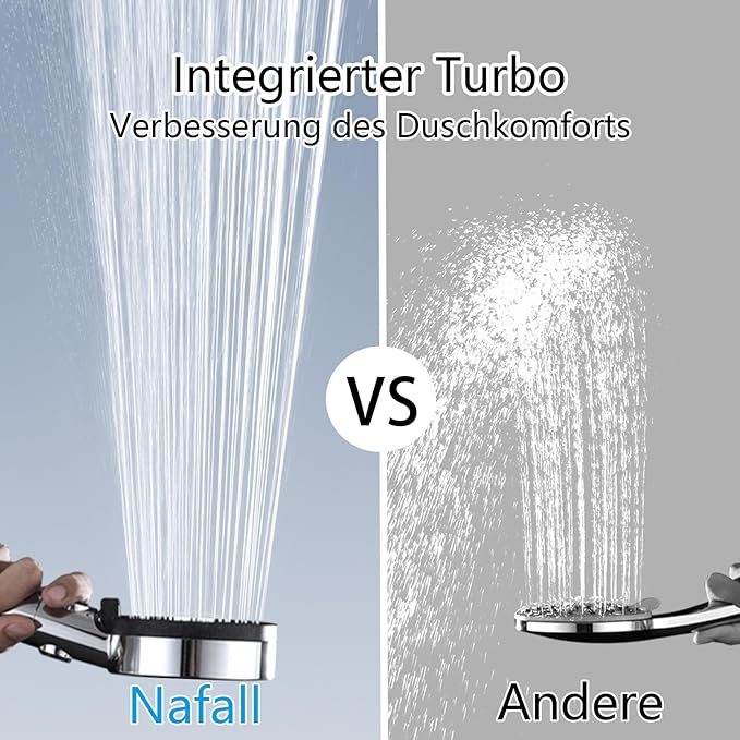 - 【Pause Mode & ABS Material】The Nafall shower head is made of ABS material and a stainless steel outlet plate, which is hard, heat-resistant, and wear-resistant, prevents clogging, and is easy to clean. The water-saving shower head has a separate pause switch that stops the water flow by pressing the switch on the nozzle. The handheld shower head is durable, leak-proof, and provides a gentle spray, allowing you to enjoy a wonderful moment of relaxation.